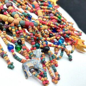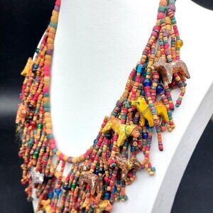 Looking for a one-of-a-kind gift or a bold accessory that turns heads? This handcrafted beaded necklace is bursting with color, charm, and personality! Featuring dozens of hand-painted wood beads and whimsical ceramic animal figures, it's the perfect statement piece for anyone who loves boho style, folk art, or handmade fashion.