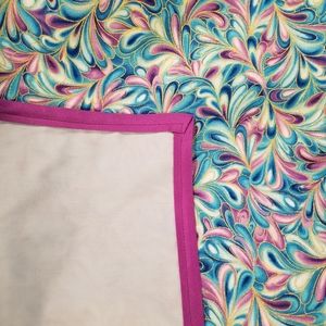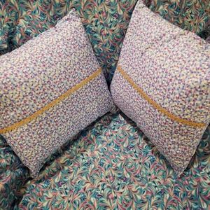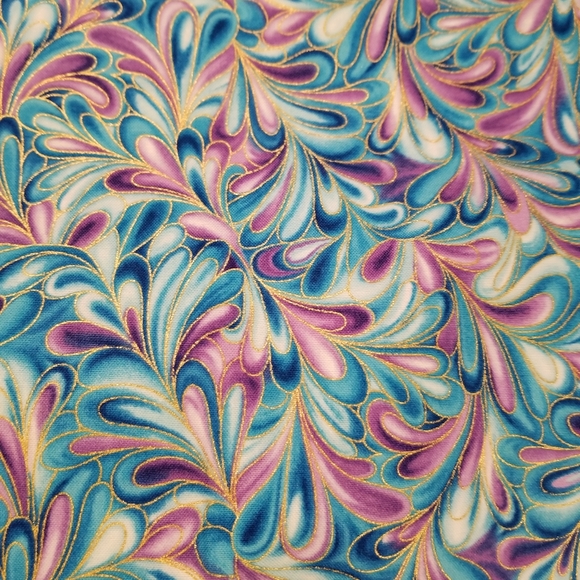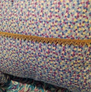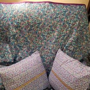 This handmade bed throw or throw blanket is so colorful and beautiful. Colors are purple, blue and light blue with metallic gold highlights. Pillow covers have similar colors, but also includes cream color with metallic gold lace embellishments outside. Throw fabric content is 100% cotton with light blue blended polyester/cotton backing and purple trim to match throw (see 6th picture). The throw measures 88"Lx43"W. Perfect addition to enhance bed. Can also serve as a table throw or lightweight partition to divide an area and more. Pillows are 16"x16".