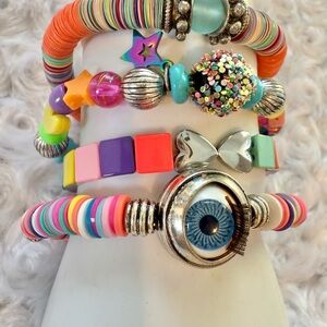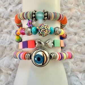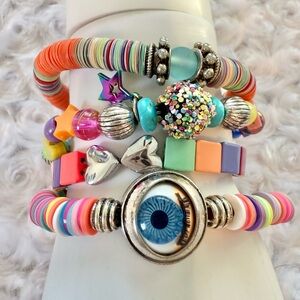 Brighten up your outfit with this vibrant bracelet set. Featuring a mix of colors including orange, pink, blue, and silver, these accessories are perfect for playful days. Please see my other bracelet collections!