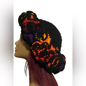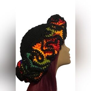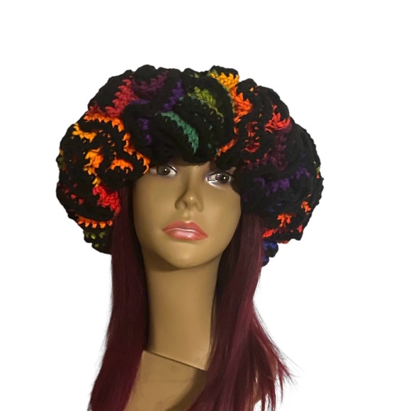 Brighten your look with this vibrant handmade crochet ruffle hat. Featuring a mix of black, orange, purple, and green, this piece adds a pop of color to any outfit. Comes with an adjustable strap for fitting.