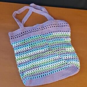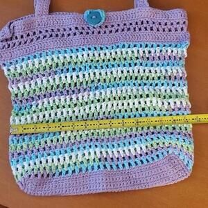 Add a touch of charm to your accessory collection with this eye-catching crocheted tote bag. Perfect for shopping, beach days, or casual outings, this bag features a vibrant design with alternating pastel stripes. Crafted from durable yarn, it offers both style and functionality. The bag includes a secure button closure to keep your belongings safe. With comfortable straps, you can easily carry it throughout your day.