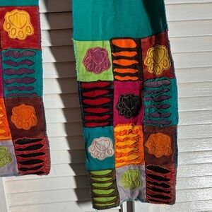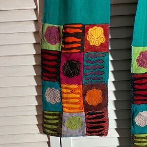 Vibrant scarf with multicolor embroidery. Perfect for adding a pop of color. 60 in join length. 7 inches wide. Cute paw prints 🐾 Gorgeous turquoise body