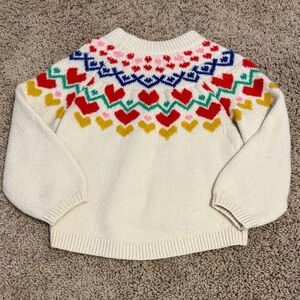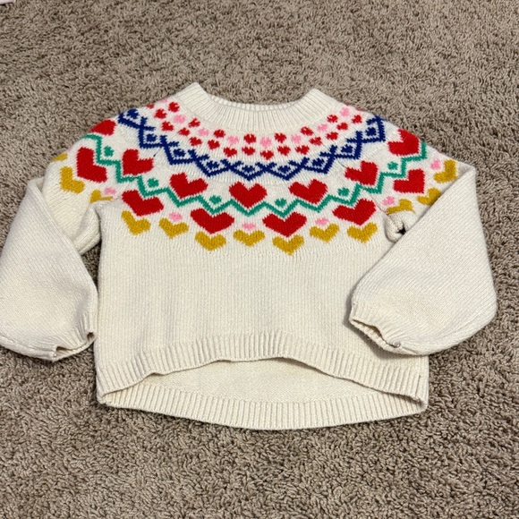 Stay cozy and stylish with this charming sweater featuring a vibrant heart pattern. Perfect for adding a pop of color to your wardrobe. In excellent condition.