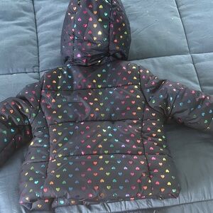 Stylish puffer jacket with a colorful heart pattern. Features a cozy hood and zip closure and pockets