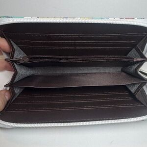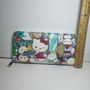 Charming wallet featuring Hello Kitty in a vibrant design. Ideal for fans of the beloved character. Brand New wallet. Measures approximately 7 1/2 inches by 4 inches in width. Has three compartments, with slots for 12 card slots, a zippered coin, and an area for bills.