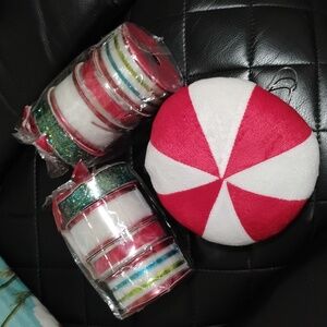 Enhance your home parties with this vibrant ribbon set. Featuring a mix of red, white, blue, and green colors, these ribbons are perfect for adding a festive touch. Ideal for decorating and crafting. Candy pillow included.