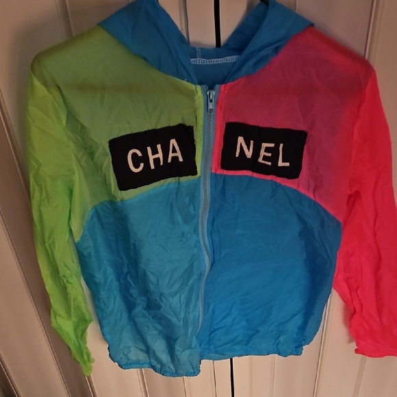 Vibrant hooded windbreaker jacket with a mix of blue, pink, and green colors. Features bold lettering on the front.