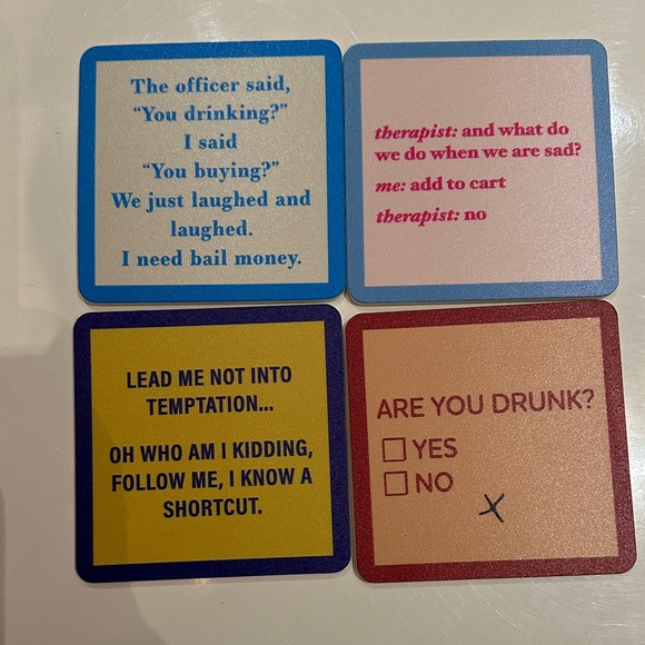 Brighten up your gatherings with this set of colorful humorous coasters. Perfect for adding a touch of fun to your home bar or dining area.
