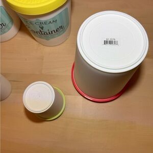 Set of ice cream containers with colorful lids. Includes pink, yellow, green, and red lids.