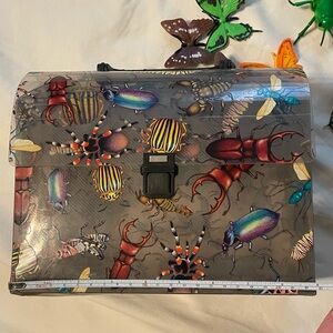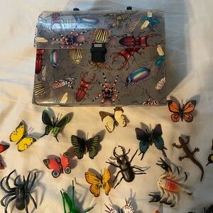 Decorative box with a vibrant collection of toy insect and butterfly figures. Includes:
