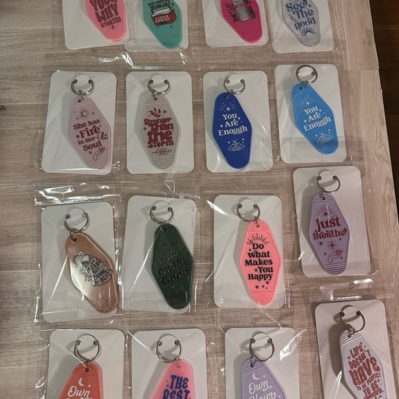 Brighten your day with this set of colorful inspirational keychains. Each keychain features a unique motivational message, perfect for daily encouragement. Available in a variety of vibrant colors including pink, green, blue, and more.