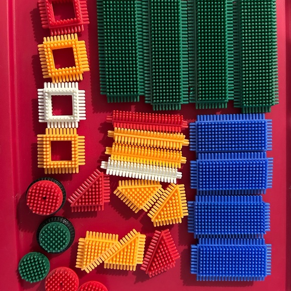 Vibrant set of interlocking building blocks. Includes red, green, blue, yellow, and white pieces. Perfect for creative play.