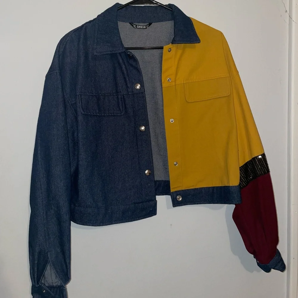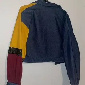 Button down multicolor jacket, balloon sleeve, with sequin strip around the arm. Blue, yellow and red.
