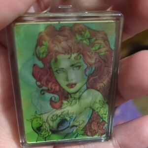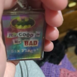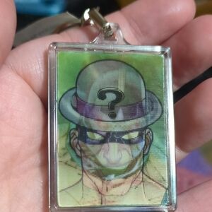 Vibrant jester-themed keychain with a playful design. Features a mix of red, black, and yellow colors.holographic keychain