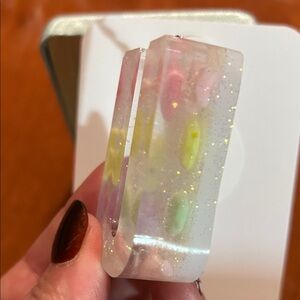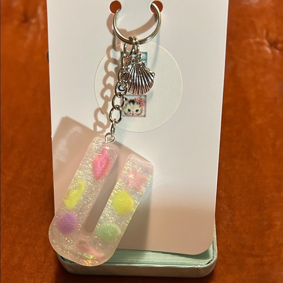 Add a splash of color to your keys with this vibrant keychain accessory. Featuring a mix of pink, yellow, and green hues, it's perfect for personalizing your belongings. Handmade resin.