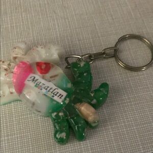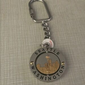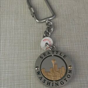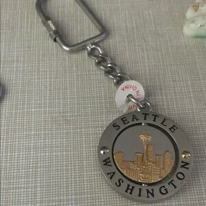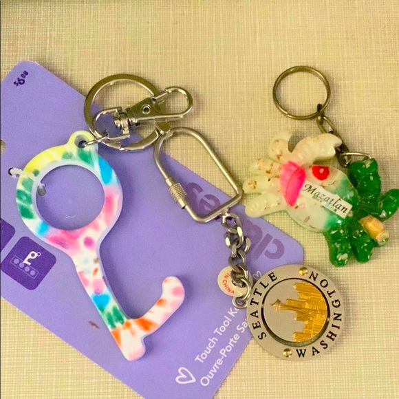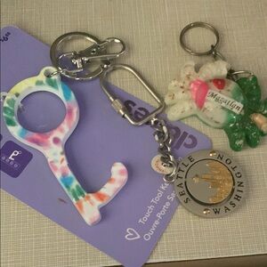 Set of three unique keychains. Includes a tie-dye touch tool, a Seattle souvenir, and a Magellan-themed piece. Perfect for adding flair to your keys.