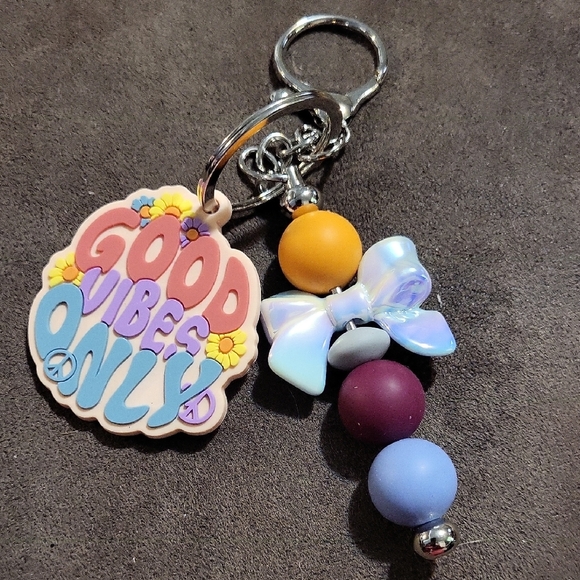 Vibrant keychain featuring a 'Good Vibes Only' charm. Includes colorful beads and a shiny bow.