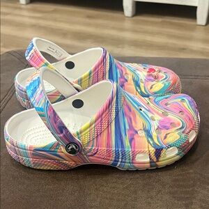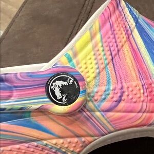 Bright and playful slippers with a swirl of colors. Perfect for fun outings.