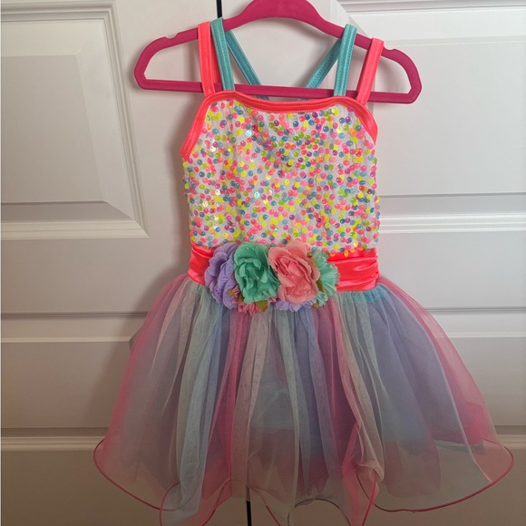 Bright and playful kids costume dress featuring a rainbow of colors. Perfect for dress-up and imaginative play.