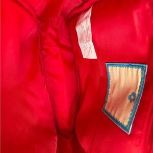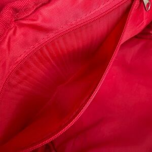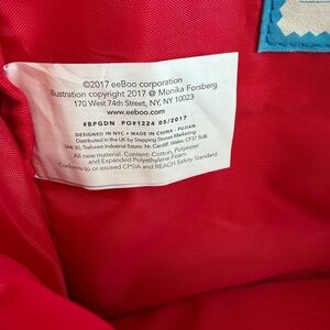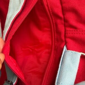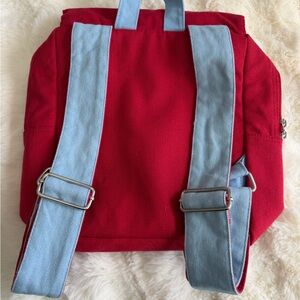 This vibrant kids' backpack features a playful embroidered design with a charming bear and floral motifs. The red and blue colors make it a delightful accessory for any child.