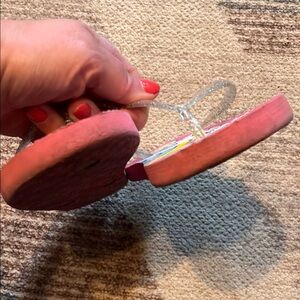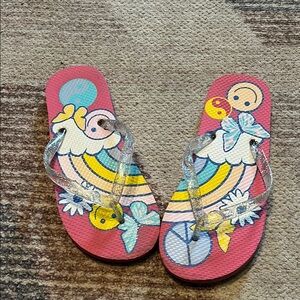 Bright and fun kids flip flops with a playful design. Perfect for sunny days. Gently used as shown . Still lots of life left. Not labeled , but I looked back at my order invoice and they are a size big kid 1-2