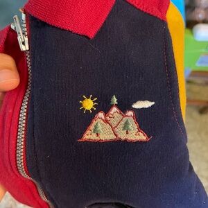 Bright and playful kids one piece featuring a vibrant mix of color blocking. Cute little details such as the embroidered mountains, collar, and zipper. Also has snap bottom. Size 0-3 months.