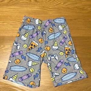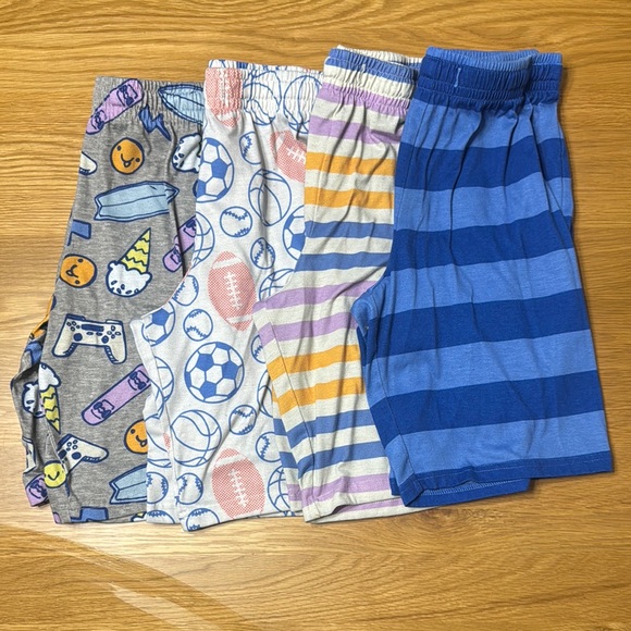 Set of four kids' shorts with fun patterns. Includes sports, stripes, and playful designs. Perfect for casual wear.