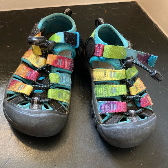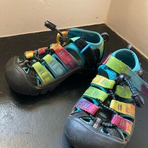 Keen’s size 9 children’s hiking/water shoes in aqua and rainbow! Features thick rubber tread and adjustable closures so you get lots of wear. Perfect for clambering on rocks, running through the woods, and moving in and out of water!!! 💦