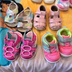 Bright and fun kids' sandals and sneakers perfect for playtime. Featuring vibrant pink and multicolor designs, these shoes offer comfort and style for your little one