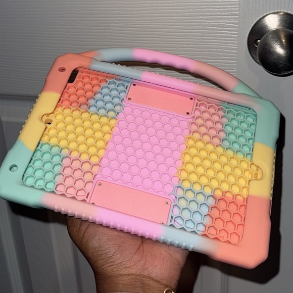 Protective and fun, this colorful kids tablet case is perfect for little hands. The vibrant design includes shades of pink, yellow, and blue, making it both functional and visually appealing.
