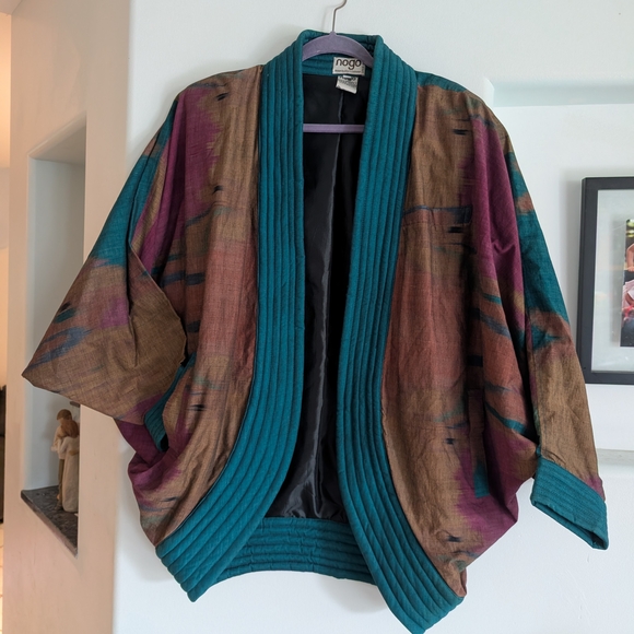 NoGo (Brand), Bali (Origin)Vintage, 80s (1980s), Kimono, Robe, Oversize The jacket in the image is a vintage NoGo silk ikat robe-style jacket. It is an oversize kimono-style jacket, likely from the 1980s, made from silk fabric in an ikat print with colors including navy blue, green, yellow, and red. It is fully lined and features shoulder pads, typical of the era and are removable