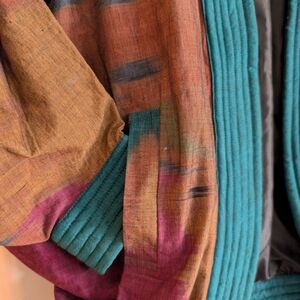 Vibrant kimono jacket with teal trim. Features a mix of brown, purple, and teal colors.