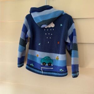 Vibrant knit hoodie with playful car and sun designs. Features shades of blue and multicolor accents.