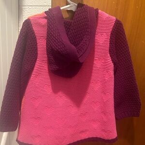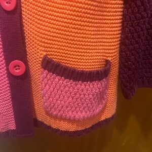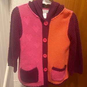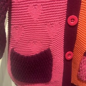Vibrant knit cardigan with a hood. Features pink and orange panels. Front pockets for added style.