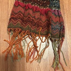 Vibrant knit scarf with a mix of colors. Perfect for adding a pop of color to any outfit! Beautiful ruching and fringe with an Ilat stripe print.
