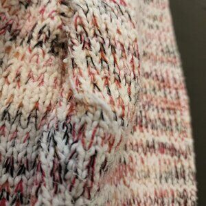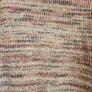 This vibrant Loft sweater showcases a multicolored knit pattern with shades of pink, white, and black seamlessly intertwined. Its soft, 100% cotton fabric provides warmth and comfort, making it an ideal choice for cozy days. The ribbed hemline and subtle side slits add a touch of sophistication to this casual, versatile piece.