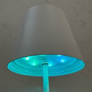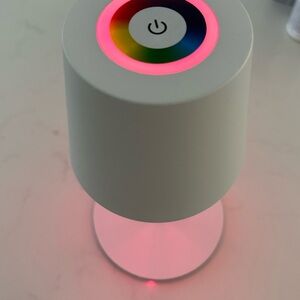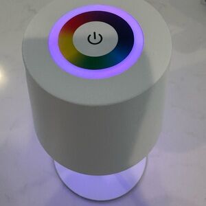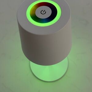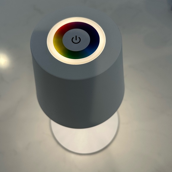 Modern LED touch lamp with a colorful top. Features a sleek white design. Comes with charging cable.