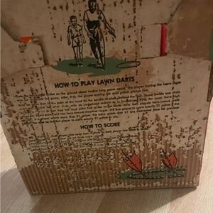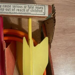 Lawn darts set featuring vibrant red and yellow darts. Includes orange rings for target practice. Ideal for outdoor fun.