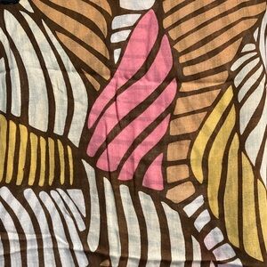 Vibrant scarf with a leaf pattern in pink, brown, and yellow. Perfect for adding a pop of color to any outfit. Measures 72x42 inches