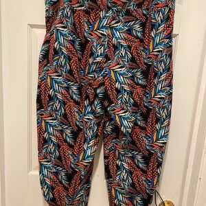 Vibrant pants with a bold leaf pattern in blue, orange, and black. Perfect for a stylish look.