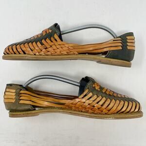 Green and tan woven leather women's huaraches Mexican sandals, MX size 5 US size 7.5. Used condition with marks & wear as shown, please see pictures.
