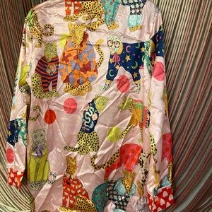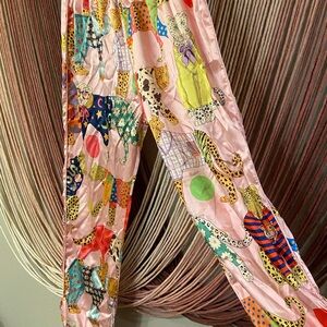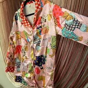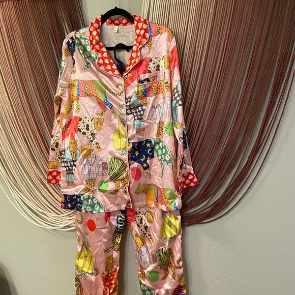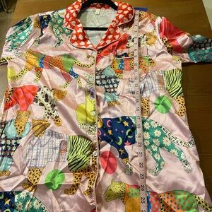 Cute pajama set with silky polyester fabric and fun leopard print. Size XL but fits more like a Large. See measurements in photos.