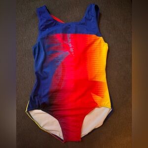 Vibrant leotard. Features a striking red and blue pattern. Perfect for a bold, athletic look.