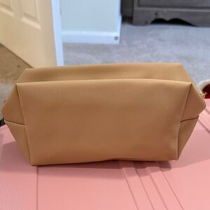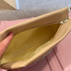 Tan pouch with colorful letters spelling 'SKIN'. Perfect for organizing essentials.