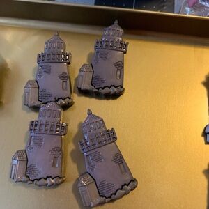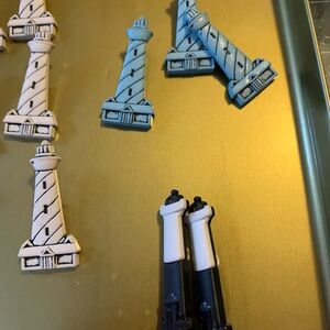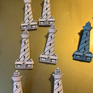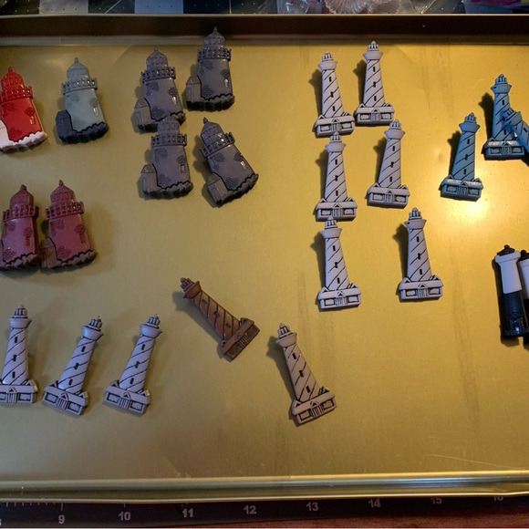 Set of lighthouse-shaped buttons in various colors. Perfect for adding these buttons to a beach shirt.,