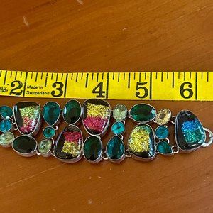8" Bracelet with Dichroic Glass in mostly teal with a pop of pink, black and gold