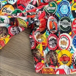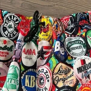 Dive into style with these colorful swim trunks featuring a unique logo pattern. Perfect for any beach or pool day.
