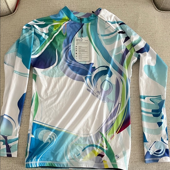 Vibrant long sleeve rash guard with abstract patterns. Features shades of blue, green, and white. NWT. Smoke & pet free home.