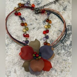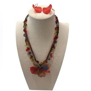 Make a bold statement with this vibrant necklace and earring set! The multistrand necklace features faceted acrylic beads in rich fall hues and a stunning layered lucite flower pendant. The matching red lucite petal earrings add a perfect finishing touch. Lightweight and eye-catching, this set is ideal for festivals, boho outfits, or brightening up any look.
