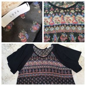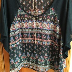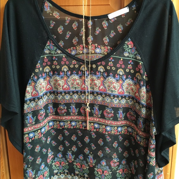 Worn recently for a birthday, great sheer top layer. I've worn over orange, green, and black and all look great! Solid black loose sleeves!
